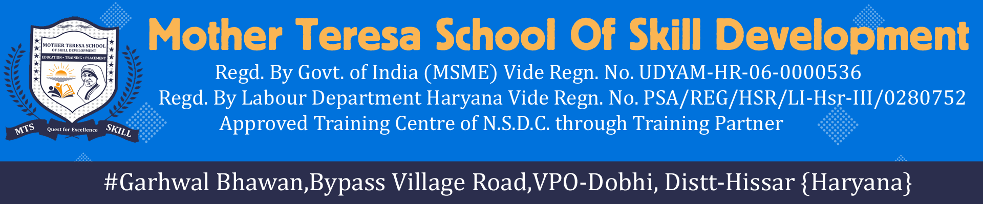 Welcome to Mother Teresa School Of Skill Development Regd. By Govt. of India (MSME) Vide Regn. No. UDYAM-HR-06-0000536 Regd. By Labour Department Haryana Vide Regn. No. PSA/REG/HSR/LI-Hsr-III/0280752 Approved Training Centre of N.S.D.C. through Training Partner